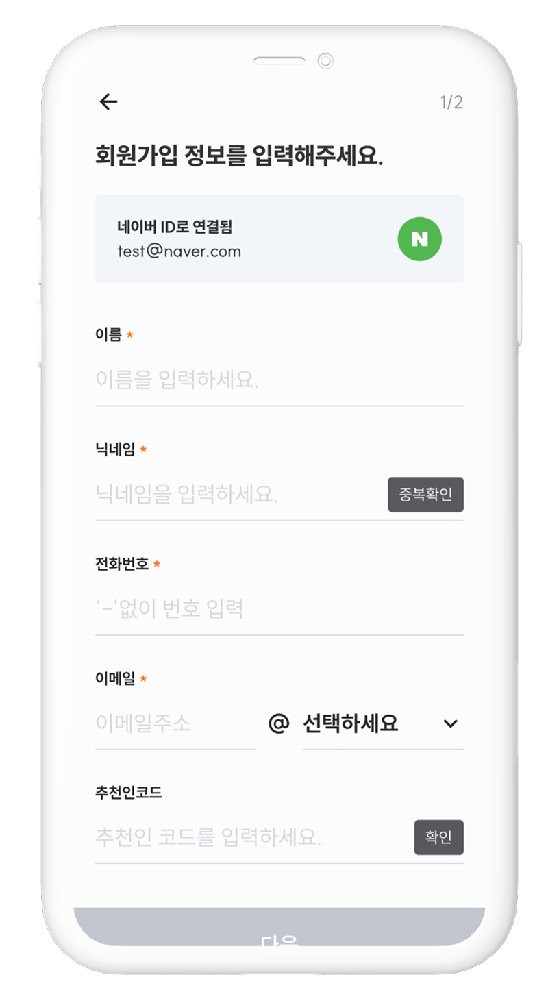 이름, 닉네임(중복 확인), 전화번호, 이메일을입력해 주세요.