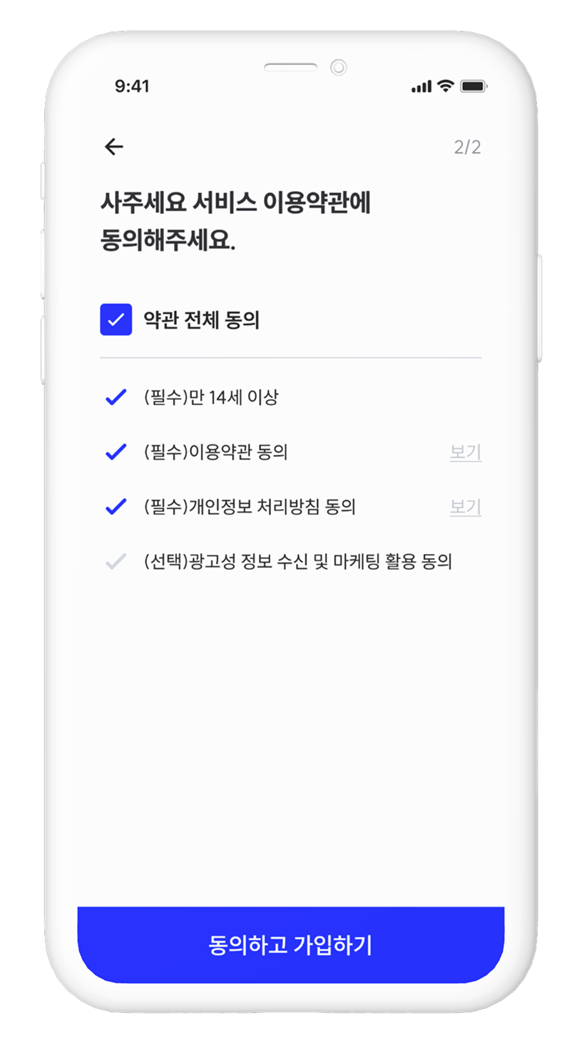 필수 약관 3가지에 동의해야 하며, 선택 약관은 광고 수신 여부입니다.