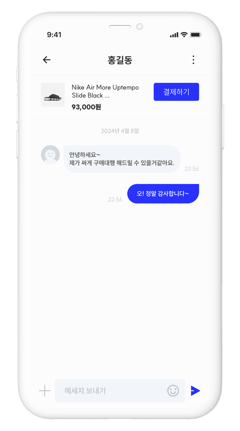 구매자가 결제를 완료하면 이름, 연락처, 주소 등 배송 정보를 채팅으로 전달받게 됩니다. 해당 정보를 바탕으로 상품을 직접 구매하고 발송해 주세요.