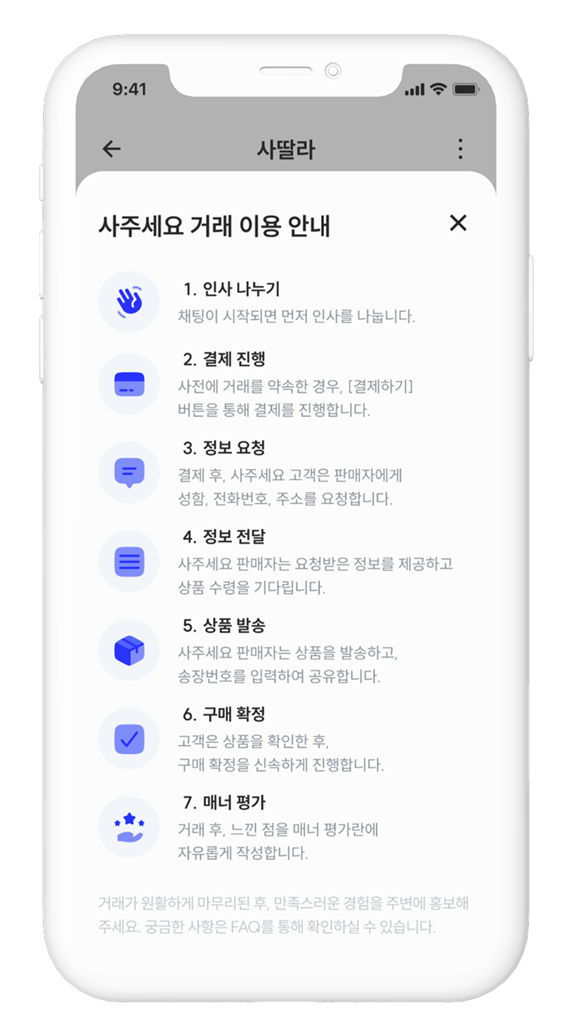 채팅을 시작하면 원활한 거래를 위한 가이드 화면이 팝업됩니다. 1번부터 7번까지 내용을 꼭 읽고 거래를 진행해 주세요.