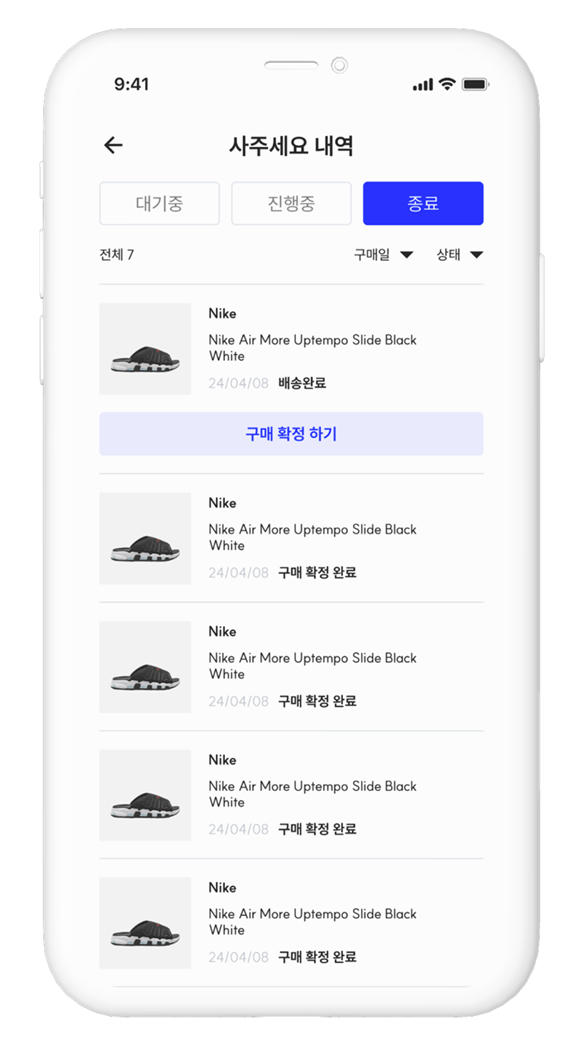구매자가 상품을 수령하고 [구매 확정]을 눌러야 거래가 완료됩니다. 거래 완료 후, 사주세요를 통해 대행 수익이 정산되어 지급됩니다.